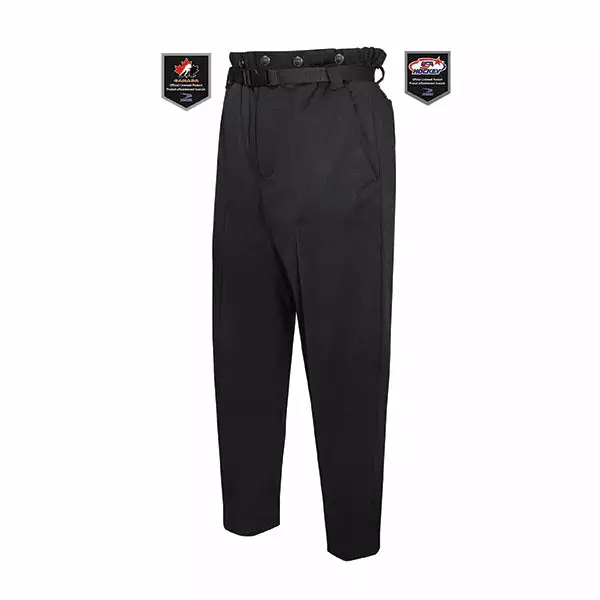 Perfect for the recreational referee. 100% polyester heavyweight doubleknit with two deep slash pockets for ease of access and room for extra whistles. Also includes two back pockets (1 with Velcro), suspender buttons, nylon belt.