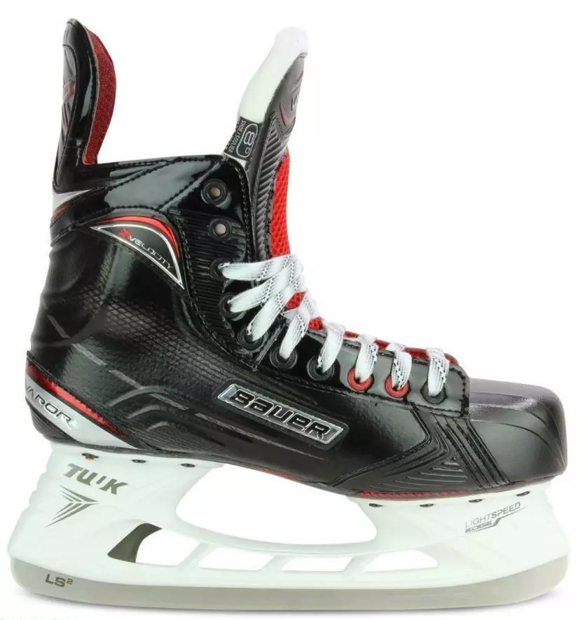 The Bauer Vapor X Velocity skates are a Source for Sports exclusive model that is based on the Bauer Vapor X600 skates with features from the Vapor X700 to offer higher performance and better value. The skates offer a tradition Bauer Vapor fit with a tapered forefoot and a tightened heel.