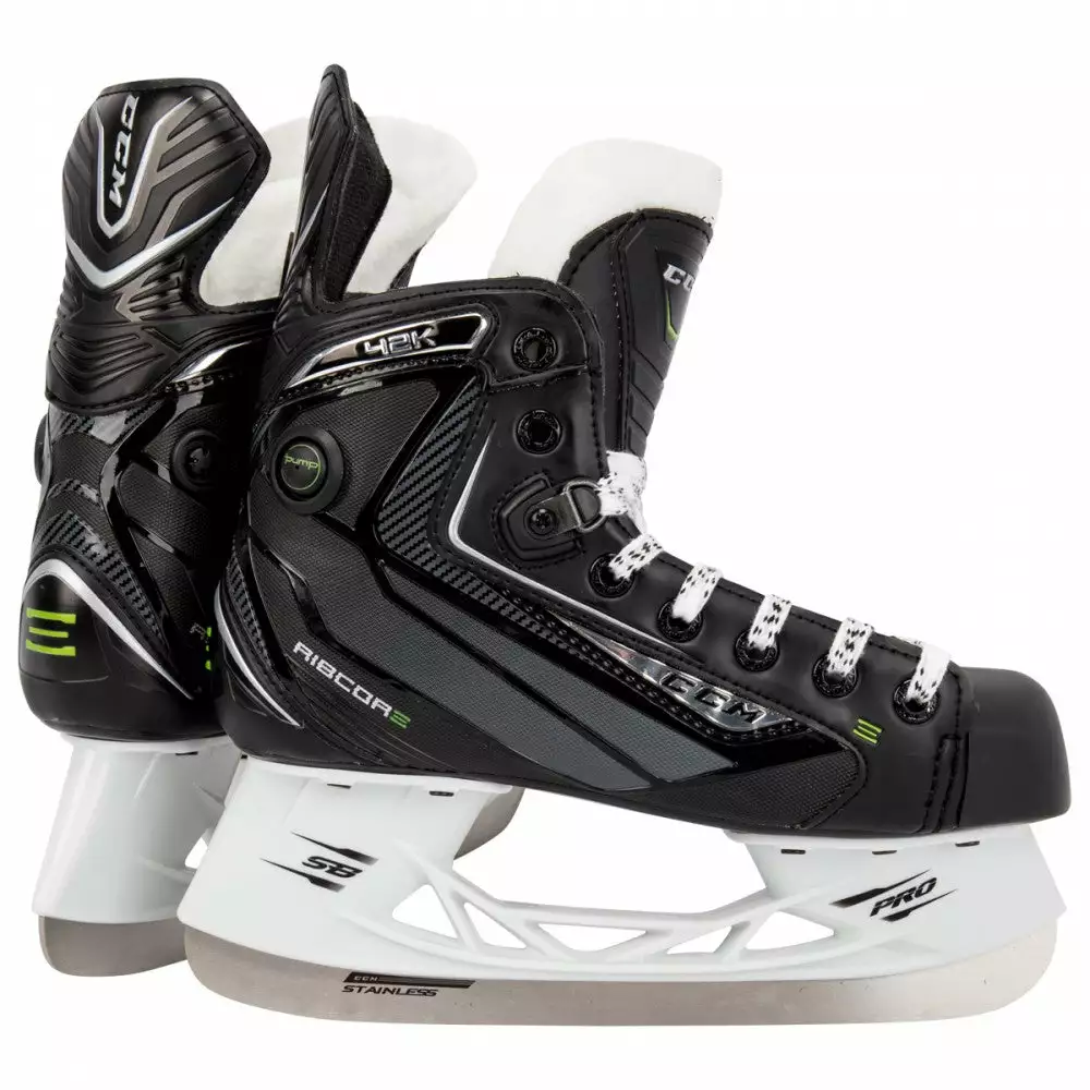 The Advanced Pump allows you to control the amount of air that you circulate into the air bladders around the ankles, thus enhancing heel lock by eliminating negative space and giving you the option to adjust for fit in a matter of seconds between shifts. It is more efficient than its predecessor as it fills quicker and holds more air. The RIBCOR 42K has a tapered fit in the ankle and is slightly narrower in the heel and the forefoot. CCM uses an elite synthetic upper as the construction in the quarter which reacts well to heat molding, and will help reduce break in time. The two elements of the agility profile that contribute to forward and backward flexibility are the boot cut and the 13° forward lean (RBZ is 10°, while Tacks are 16°). Heel lock is achieved from a combination of a tapered fit in the ankle, the use of internal ankle foams, and the Advanced Pump.The tongue is made of a 7mm high density felt with a foam insert. The RIBCOR 42K has the vented low profile injected outsole which serves as the platform for mounting the SpeedBlade 4.0 Pro holder, which also features the additional 4 mm in height, just like the SpeedBlade 4.0 +, to help increase the angle of attack. The laces are designed to have a secure hold, with the lace-lock preventing the laces from becoming loosened. A non-replaceable long lasting stainless steel runner is included