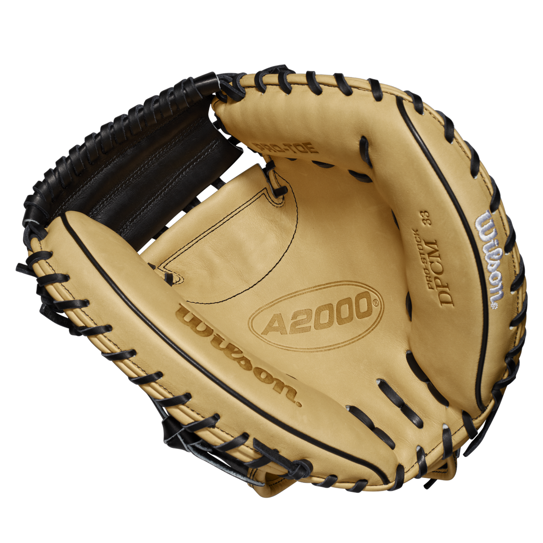 Handle pitches in the dirt with the A2000 CM33. Designed with a deeper pocket and catching area for better control, this model is perfect for catchers who are active behind the plate. With a thinner heel pad than most mitts, the glove is lighter and breaks in quickly. Constantly improving patterns. Materials that perform. Dependable construction. The evolution of the A2000 baseball glove continues to be driven by insights from the Wilson Advisory Staff. This is why hardworking players love its unmatched feel, rugged durability and perfect break-in. ‚ 33″ Catcher’s Model ‚Half Moon Web ‚Extended Palm ‚MLB Most Popular Catcher’s Mitt Pattern ‚Blonde/Black Pro Stock Leather for a long lasting glove and a great break-in ‚DriLex Wrist Lining to keep your hand cool and dry